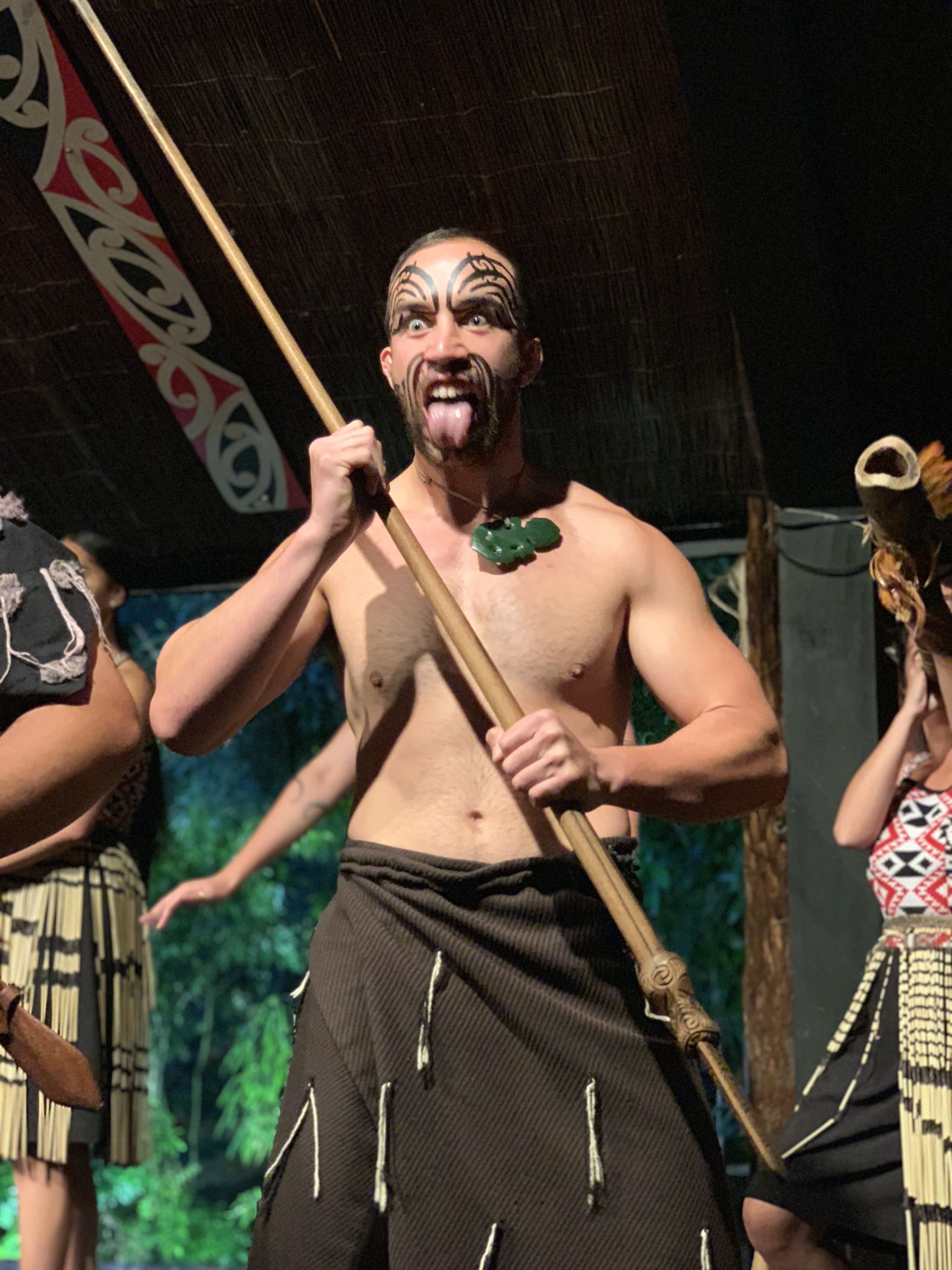 From the moment we joined the group on our bus the driver began talking about the ancient traditions of the warriors and the tribes. He explained that chiefs are traditionally men and selected one of the men on our bus to act as our chief to the Weka tribe we had become. When disembarking we were lead to the entrance to the Tamaki Maori Village and each chief from the tribes had to engage in the traditional ritual with the chief of the village. It was really important for us to keep a straight face, as we had been warned not to laugh or smile as this would be regarded as being disrespectful. One woman from our tribe clearly had no idea what was about to happen and as the warriors came to warn and greet our chiefs doing the Hakka and making loud noises, she literally screamed and cowered! We weren’t allowed to laugh of course so I was covering my face and squeezing my cheeks to stop a snort from escaping! I have laughed a lot about it since.