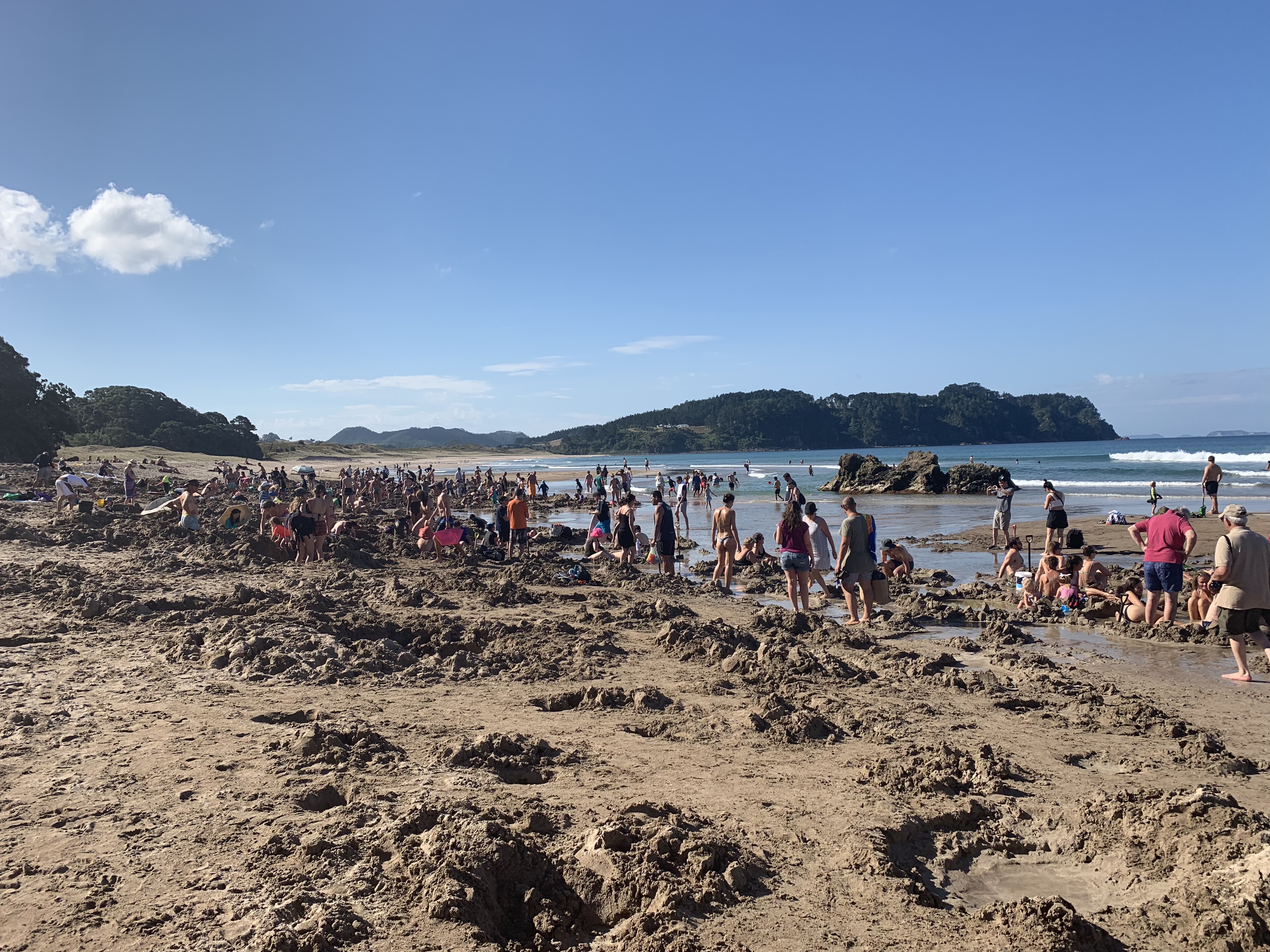 Our next destination was Hot Water Beach which is located in the beautiful Coromandel on the East coast of New Zealand. The beach gets its name from the underground hot springs that filter up and bubble through the sand, if you dig down you can make your own hot water pool— which makes the beach extremely popular!